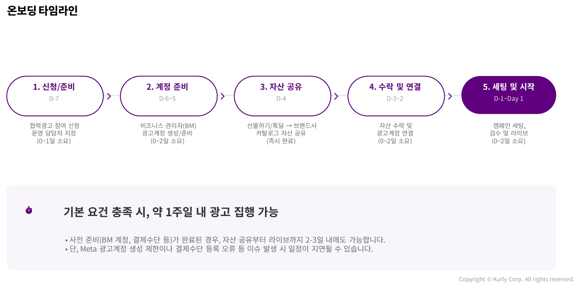 사전 준비(BM 계정, 결제수단 등) 가 완료된 경우, 자산 공유부터 라이브까지 영업일 2~3일 내에도 가능합니다. 단, META 광고 계정 생성 제한이나 결제수단 등록 오류 등 이슈 발생 시 일정이 지연될 수 있습니다.